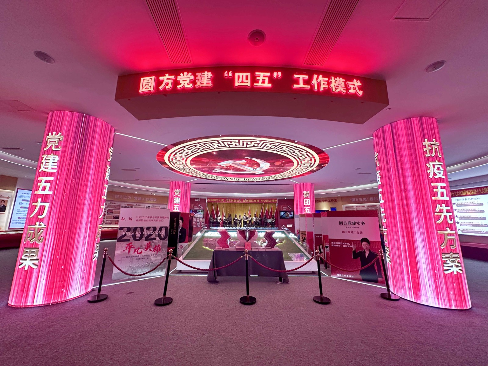 郑州圆方非公有制党建学院展馆以“梦想启程、红色探索、信念凝铸、辉煌成就、共筑未来”五大核心篇章为轴,串联起郑州圆方集团在党旗引领下的创业、成长与荣耀之路。从初心厅的历史回响,到创业厅的筚路蓝缕;从探索厅的机制创新,到抗疫厅的责任担当;从沉浸式还原建党、长征、延安精神的信仰厅,到展现大数据赋能党建的科技前沿……十余个主题展厅,以丰富多元的维度,构建起一个集思想性、教育性与体验性于一体的党建生态体系。